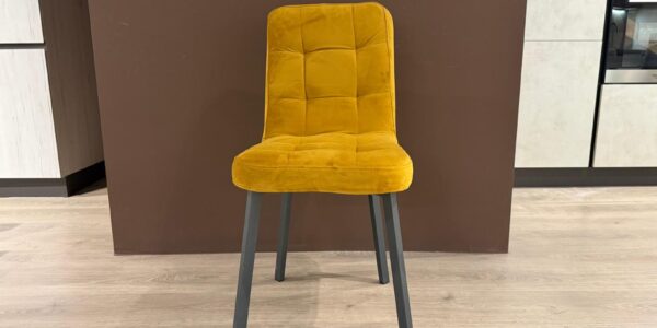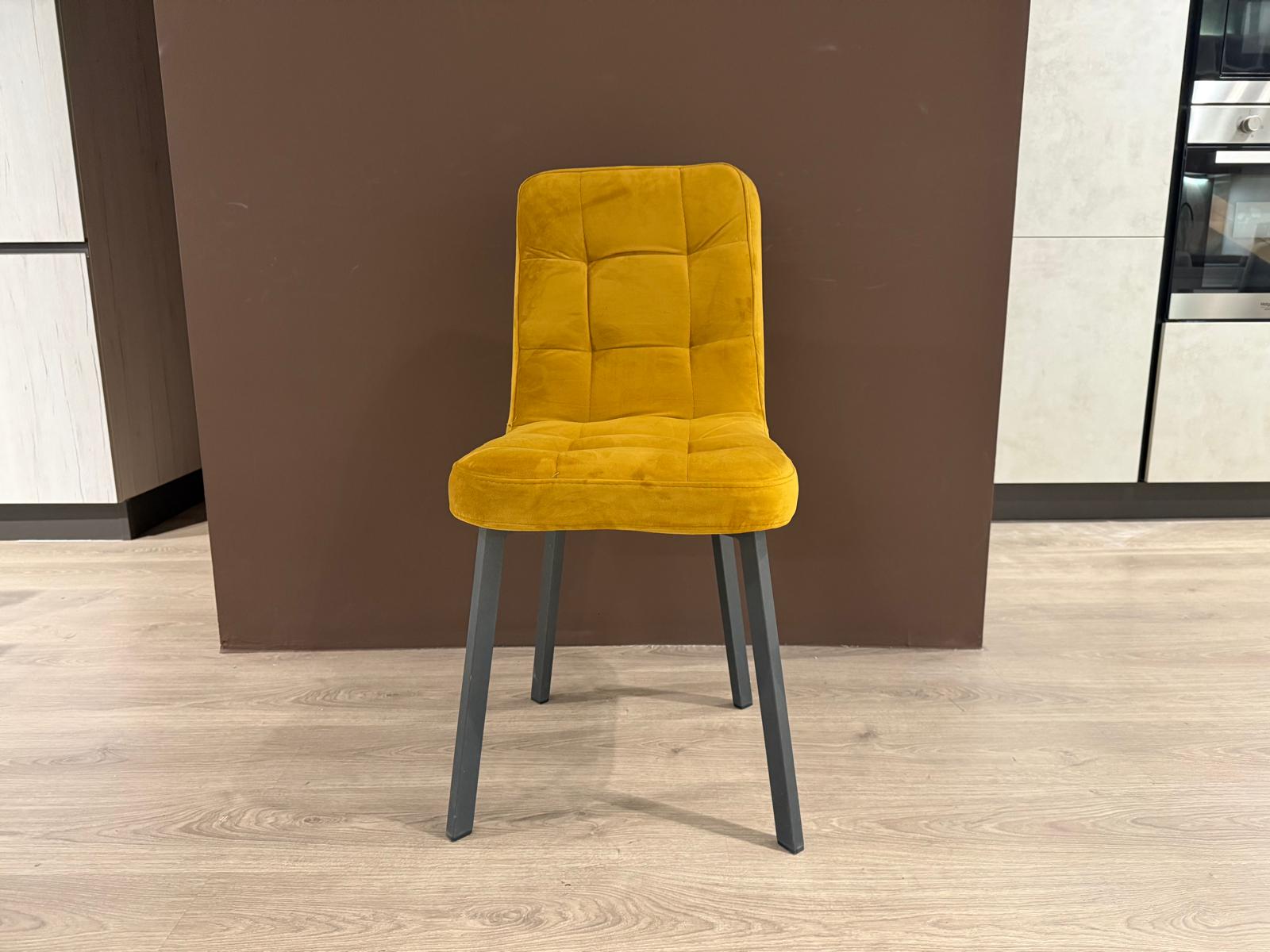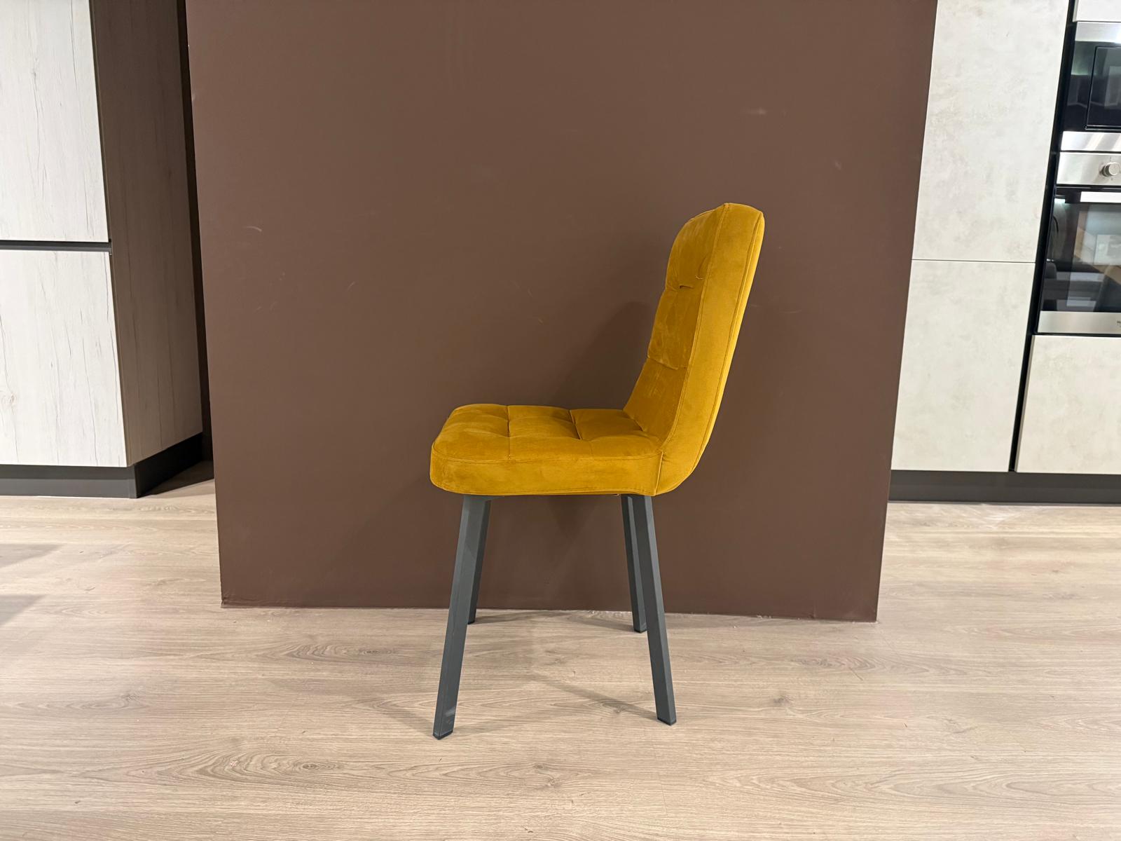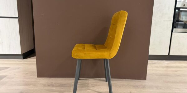 Loretta 8 è una sedia rivestita in tessuto antigraffio velluto senape, con gambe in metallo verniciato con prodotti ecologici e anticorrosione. Ideale per vari interni come soggiorni o sale riunioni.