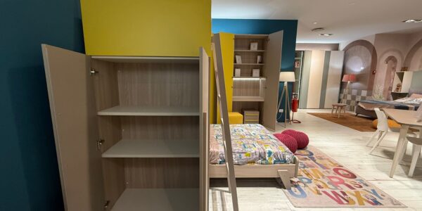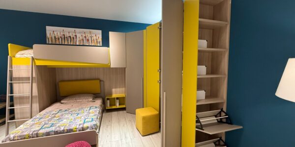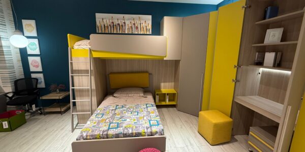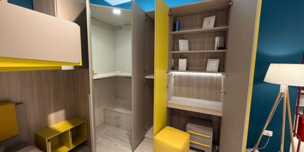 Immagina una cameretta angolare che ottimizza lo spazio e offre un ambiente accogliente e funzionale, adatta a ogni età. Grazie ai colori vivaci e a un design moderno e versatile, è perfetta per stimolare la creatività di tutti. Gli armadi integrati e i letti salvaspazio garantiscono ordine e praticità, rendendola il luogo ideale per studiare, giocare e sognare!