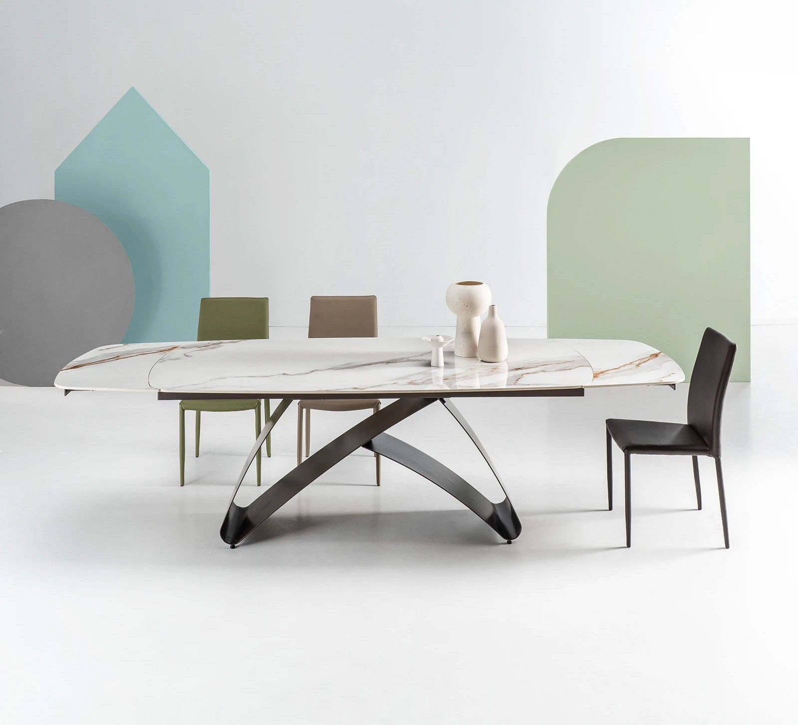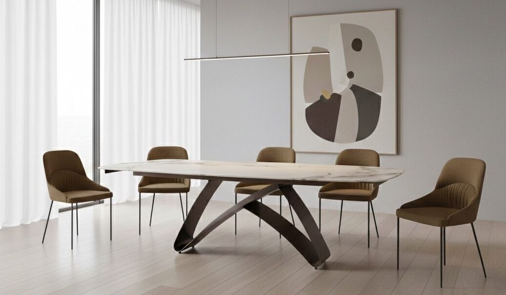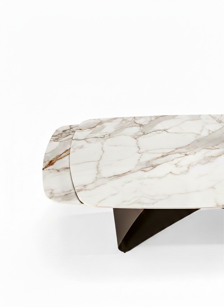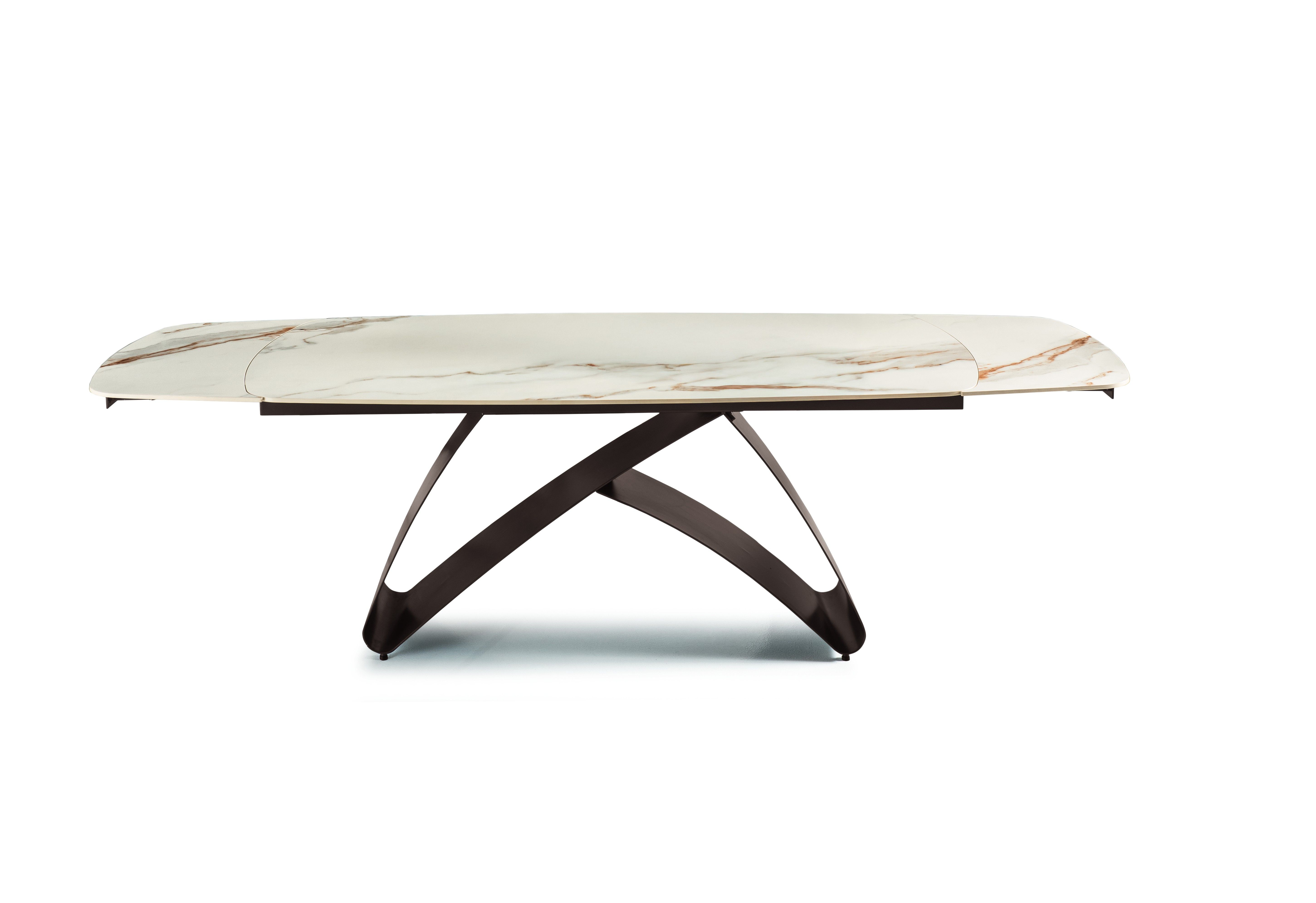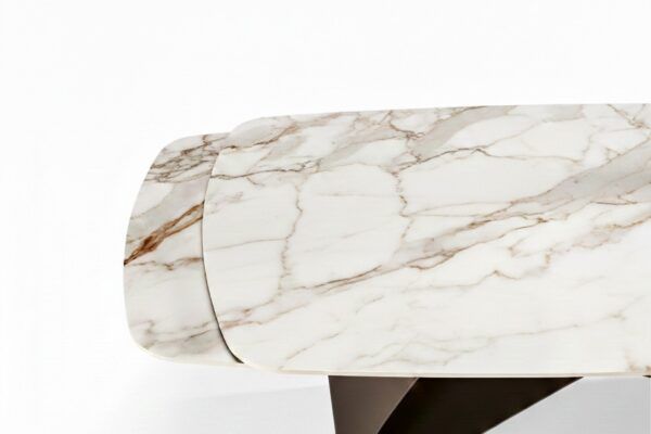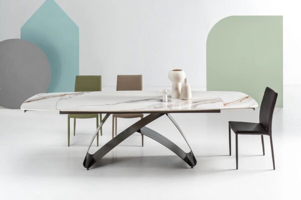 Il tavolo allungabile Blade allungabile Cal cattura lo sguardo con il suo piano a botticella in pietra sinterizzata effetto marmo, un’eleganza decisa che resiste alle sfide quotidiane, trasformando ogni pasto in un momento speciale.
