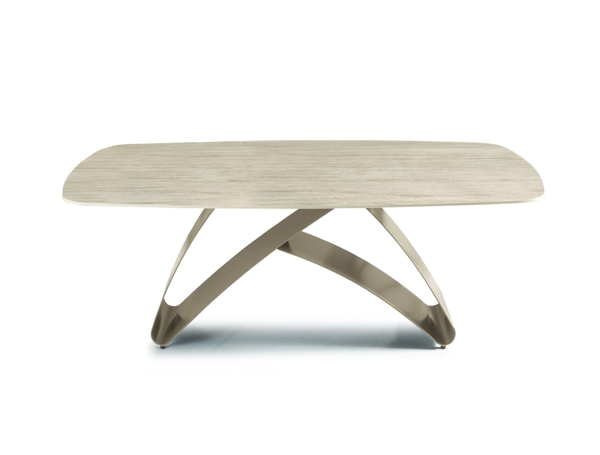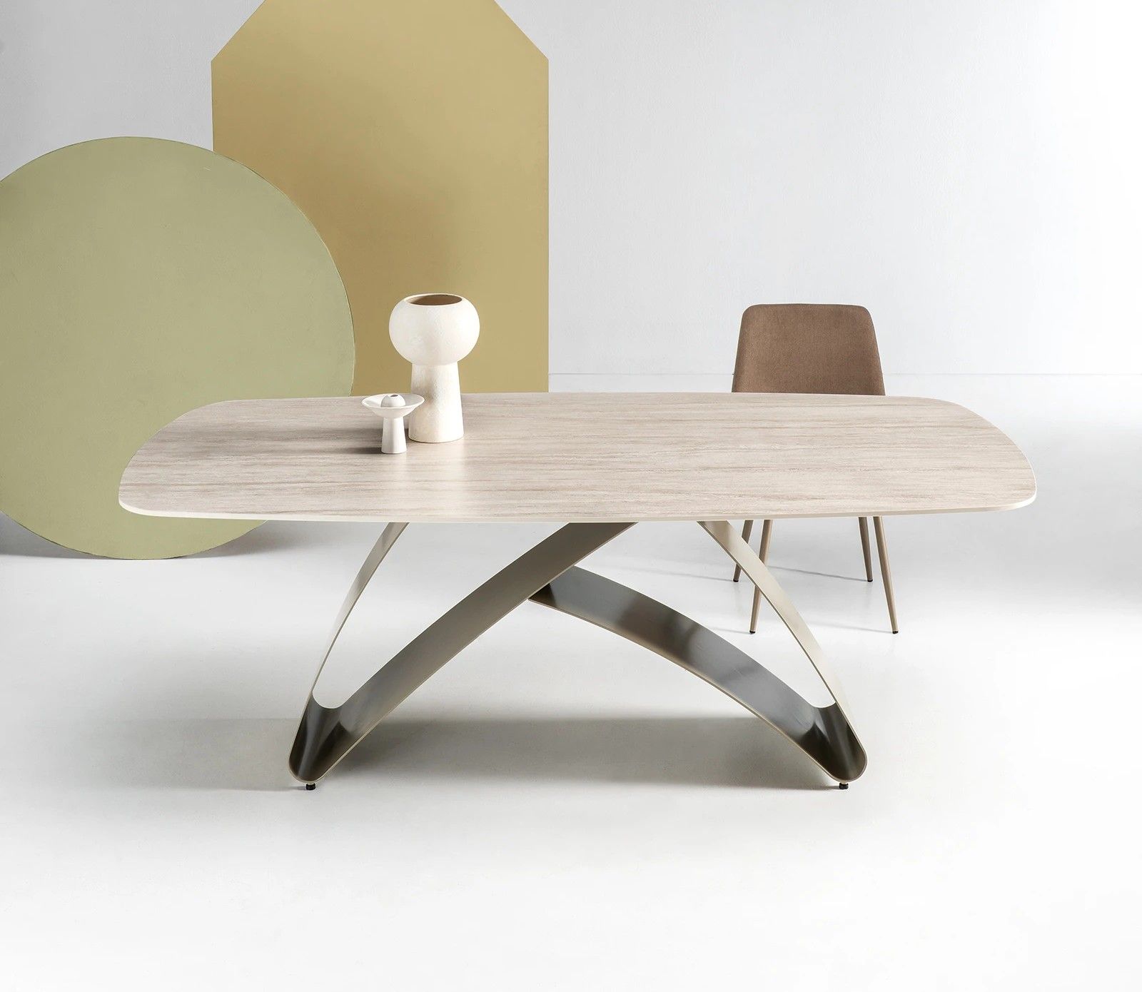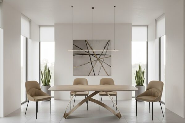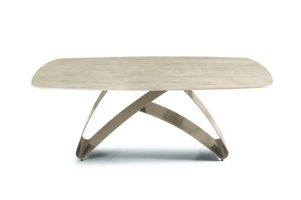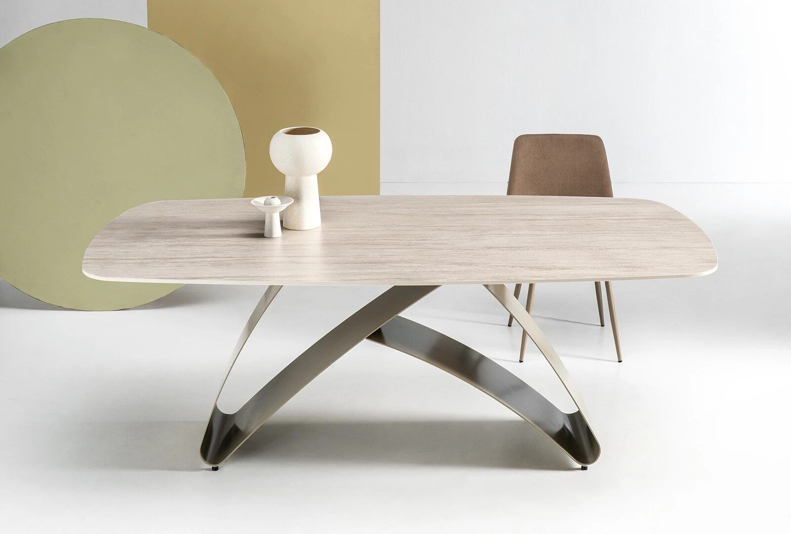Il tavolo fisso Blade Tra cattura lo sguardo con il suo piano a botticella in pietra sinterizzata effetto marmo, un’eleganza decisa che resiste alle sfide quotidiane, trasformando ogni pasto in un momento speciale.