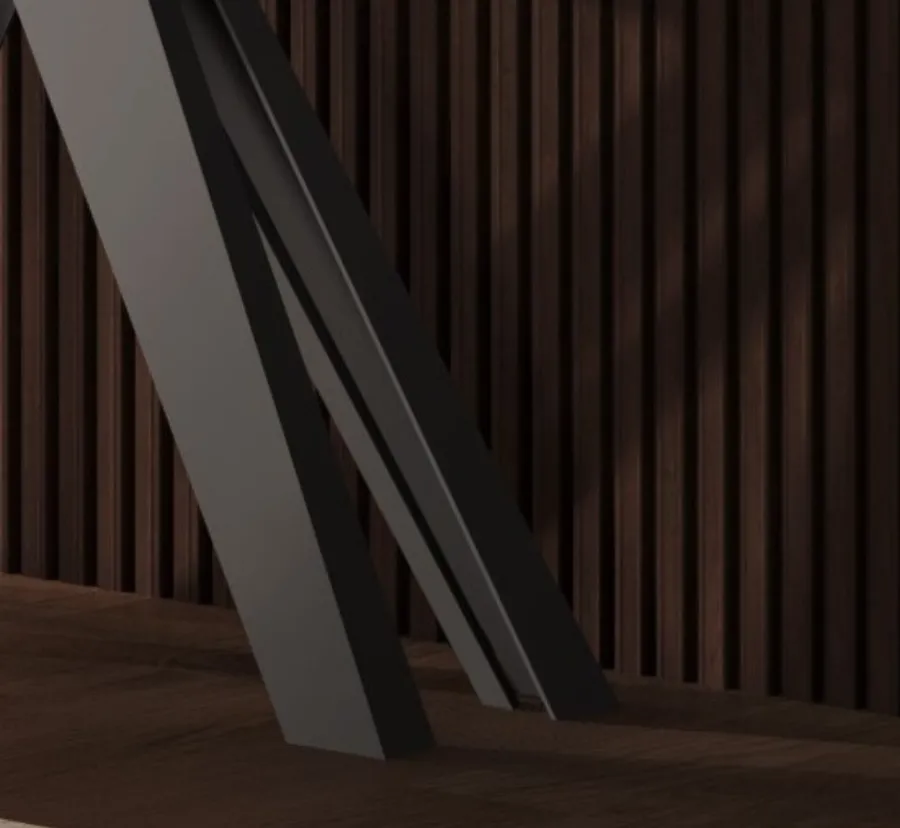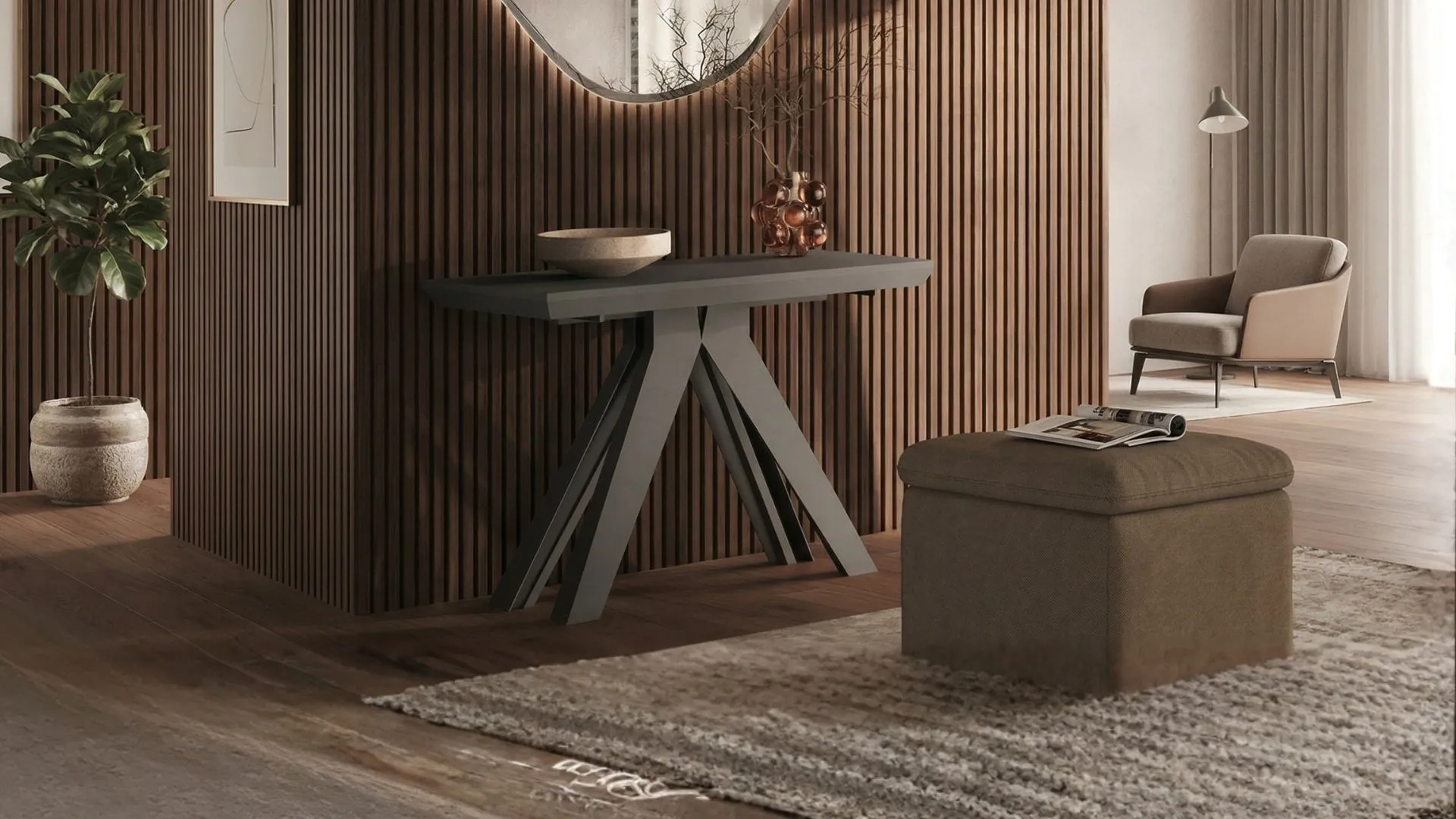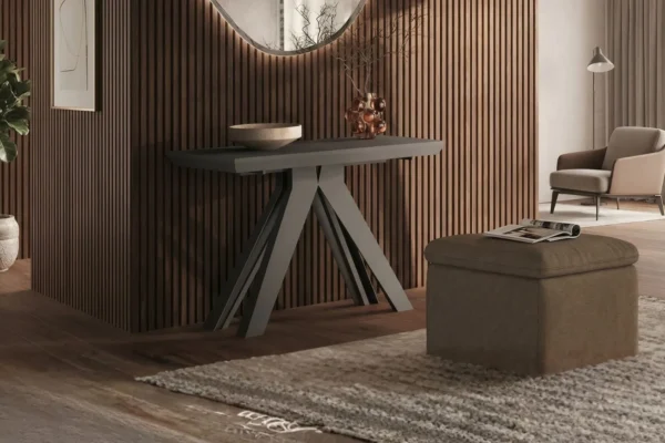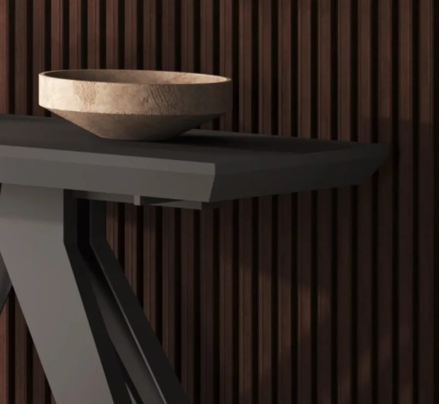 La sua struttura solida e raffinata in finitura antracite, realizzata in metallo verniciato, dona un tocco contemporaneo e sofisticato, mentre il meccanismo telescopico in alluminio permette di estenderlo con estrema facilità trasformandolo da consolle compatta a tavolo ampio e accogliente con piane e allunghe in melaminico.