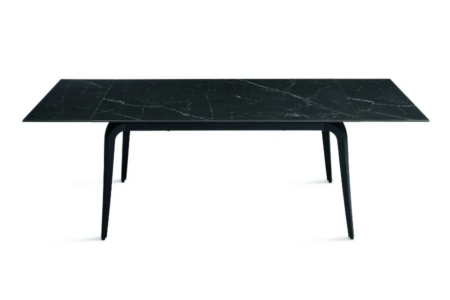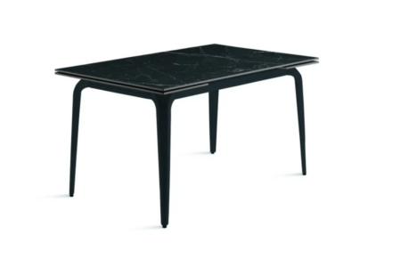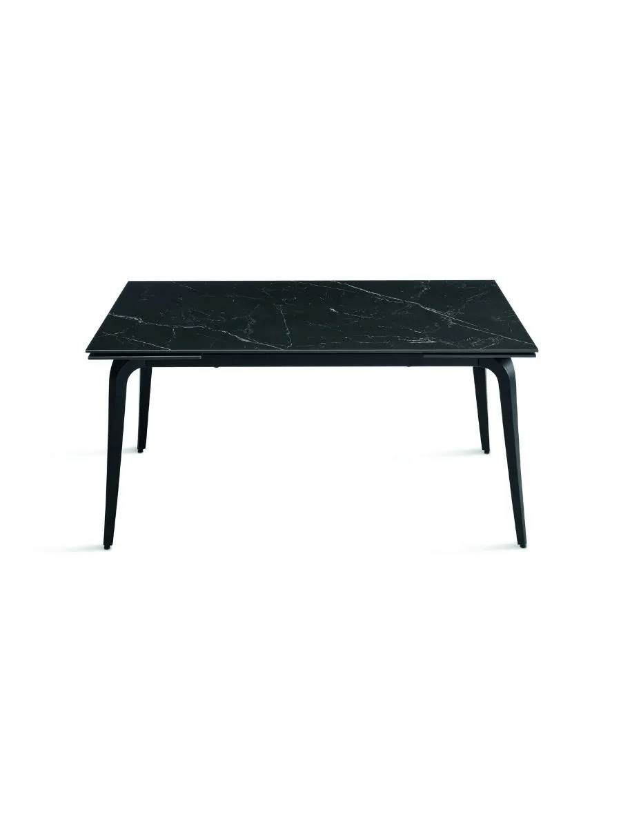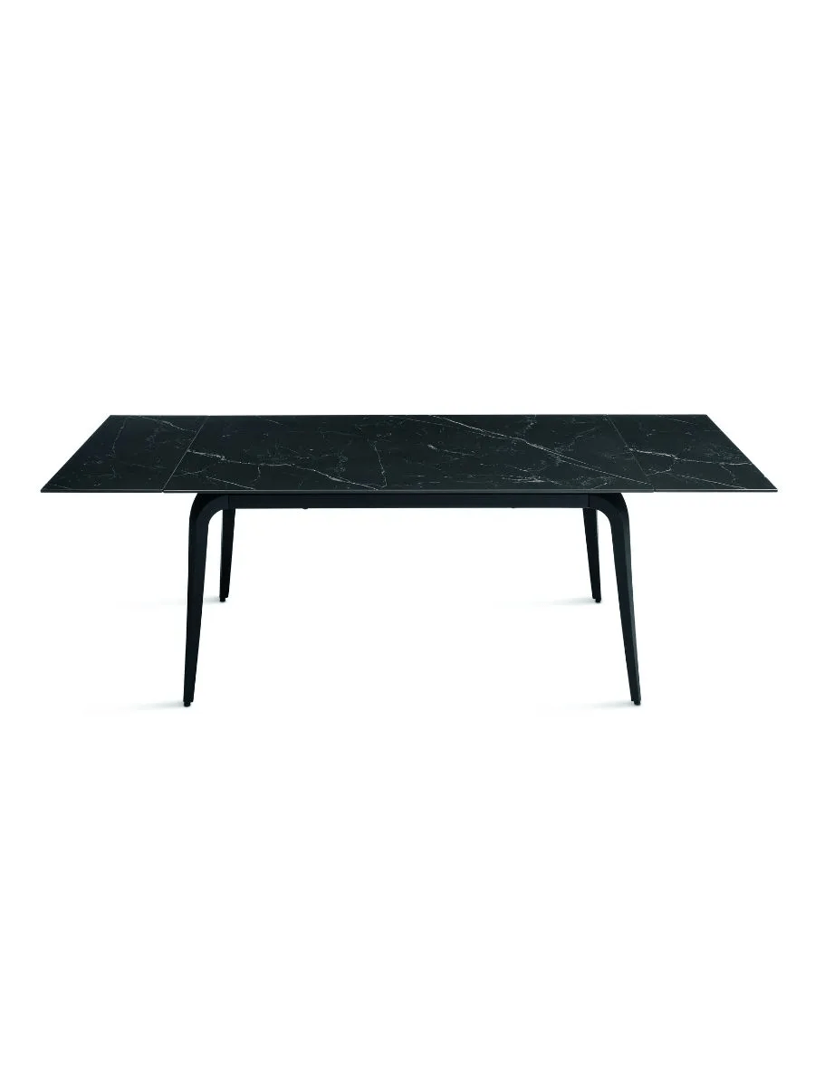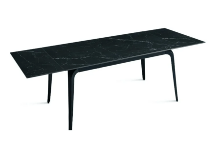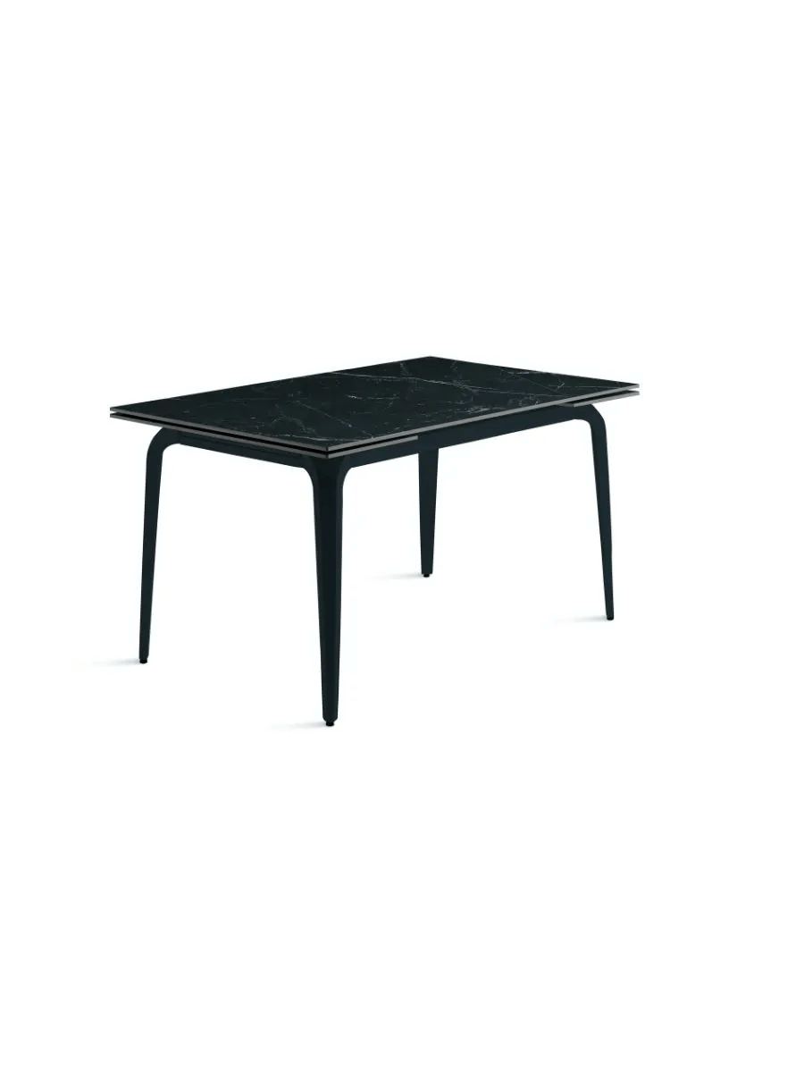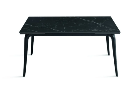 Il piano in pietra sinterizzata effetto marmo garantisce resistenza, durata e facilità di manutenzione, mentre la base in metallo verniciato assicura stabilità e solidità. Grazie alle due allunghe da 40 cm, si estende facilmente adattandosi a diverse esigenze di spazio.