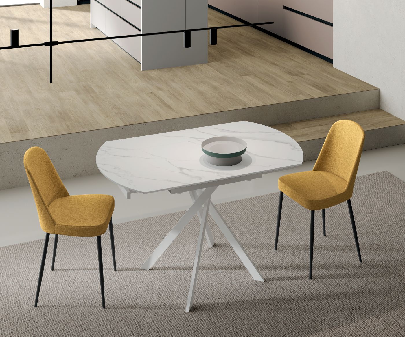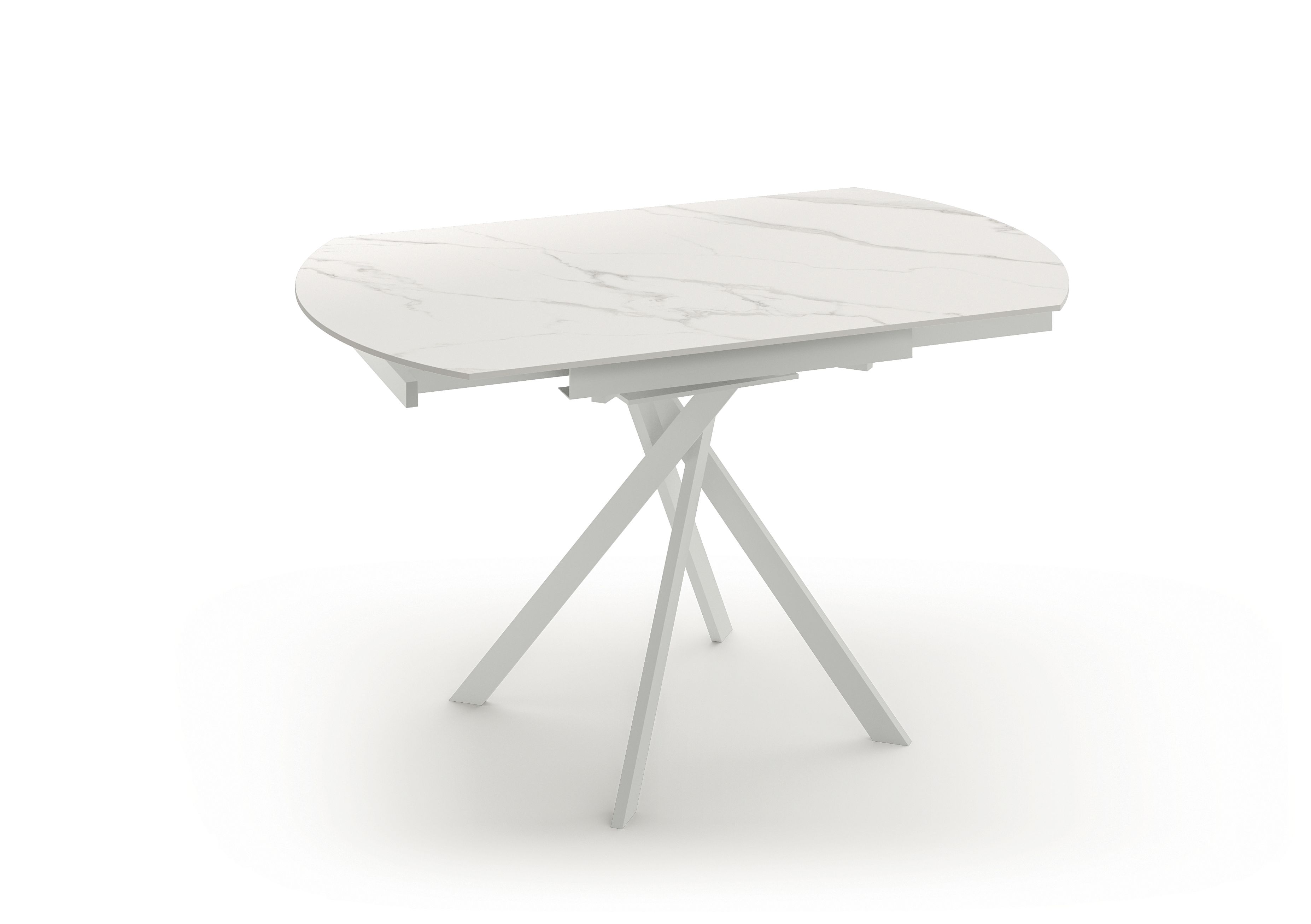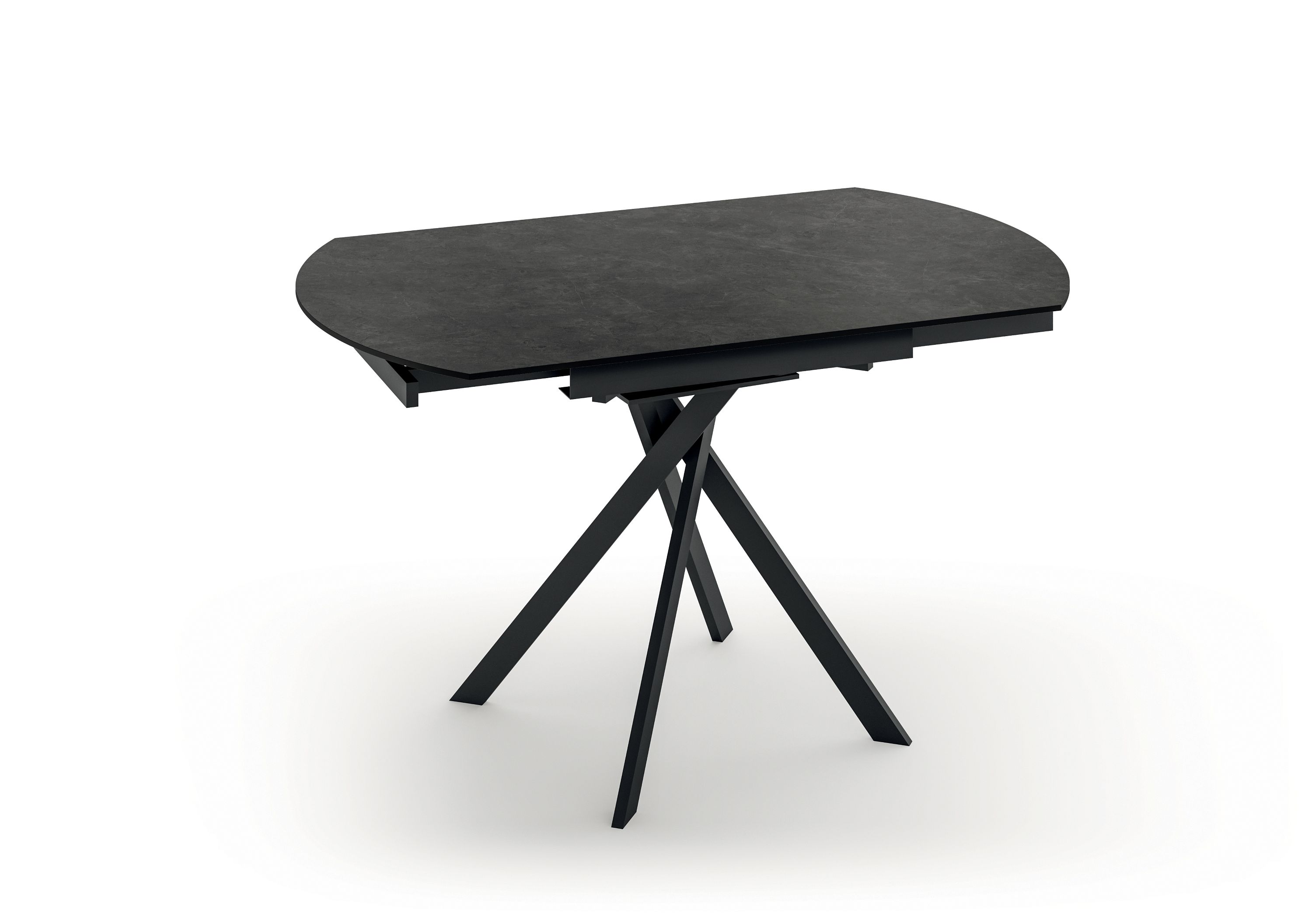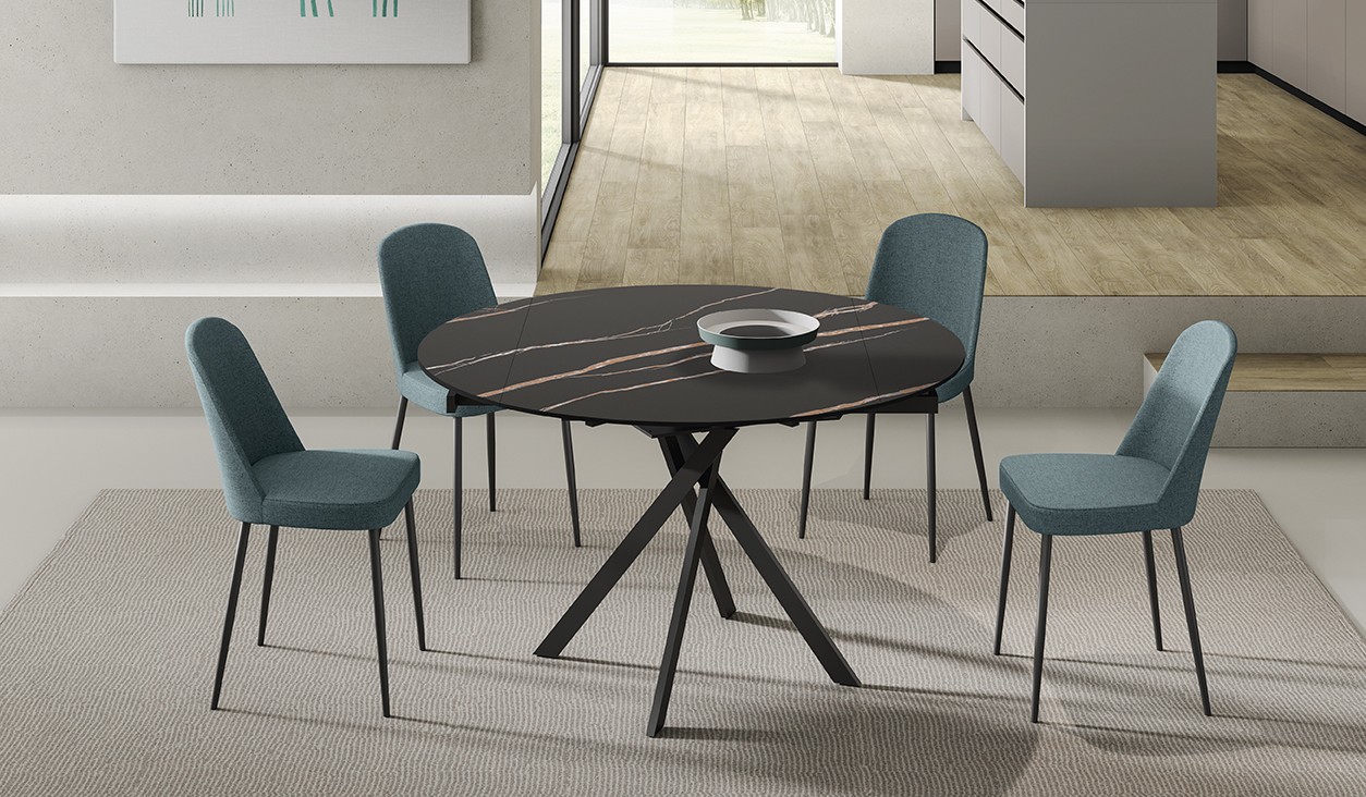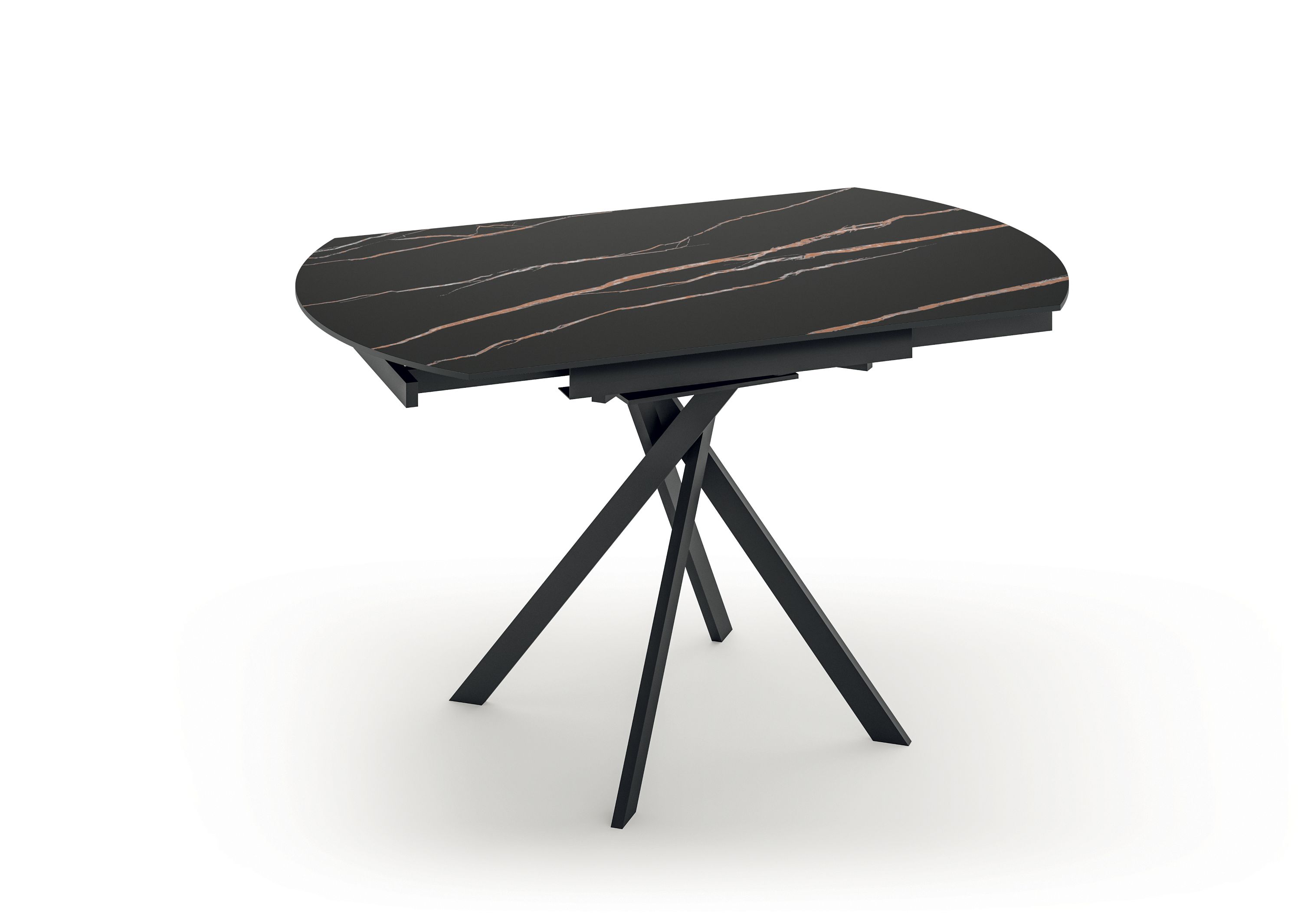Formato da un piano in effetto marmo nero, bianco o grigio scuro che diventa rotondo raggiungendo un diametro di 120 cm e da gambe in metallo verniciato nero, è ideale per la sala da pranzo e per il salotto.