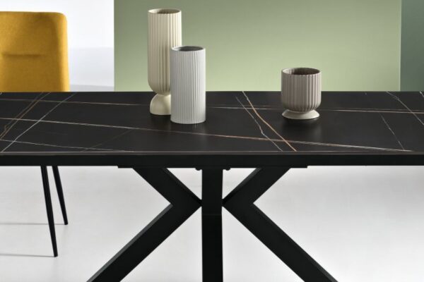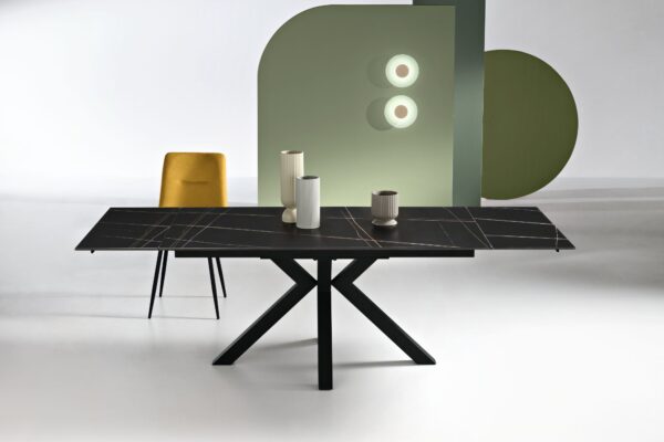 Design è la parola d’ordine per questo tavolo; definito da una struttura geometricamente composta e reso unico da un piano in effetto marmo antracite, questo tavolo si distingue per il suo progetto studiato in ogni particolare, renderà personale lo stile della vostra casa.