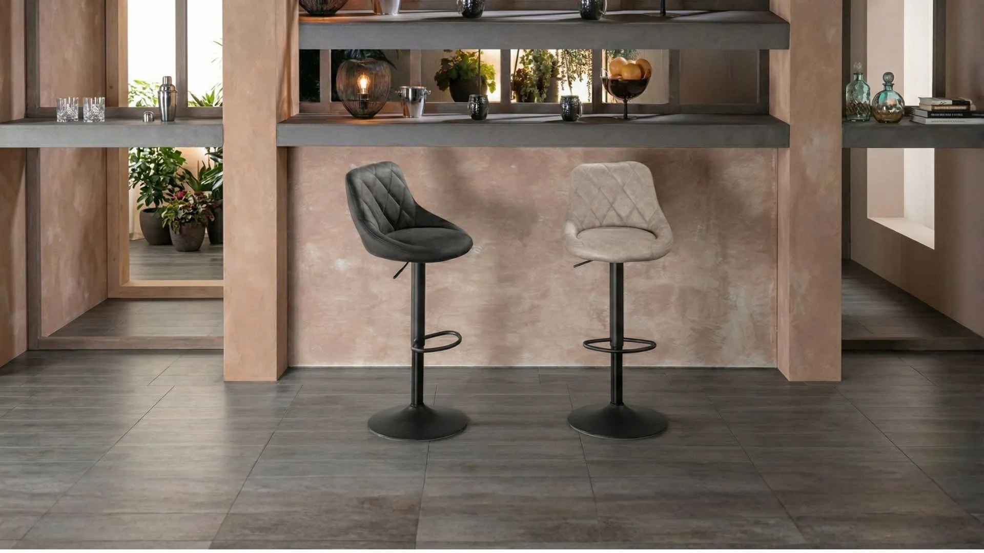 Sgabello girevole con seduta imbottita di schiuma e interamente rivestita in microfibra e con trapuntatura a forma di quadrati, regolabile attraverso un semplice meccanismo con pistone a gas. Formato da un a piantana in metallo nero opaco che presenta un design raffinato rendendo l’ambiente caldo e rilassante.