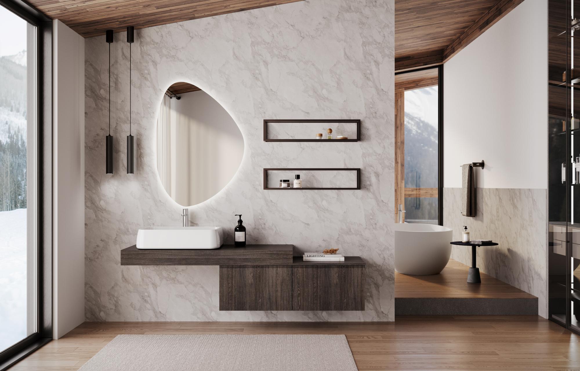 Immagina un bagno che fluttua tra legno caldo e marmo chiaro: il bagno Nilo ti avvolge con linee sospese, lavabo integrato e specchio ovale luminoso, perfetto per uno stile moderno e accogliente.