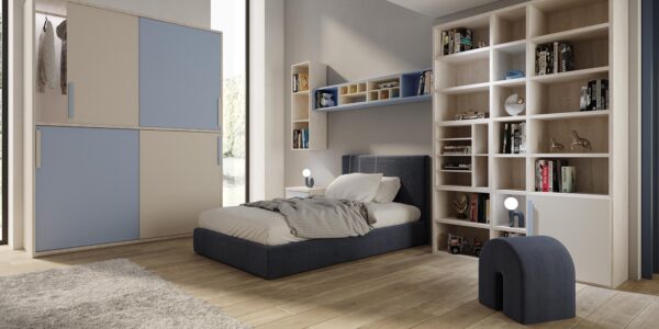 Composta da armadio scorrevole a quattro ante, ampia libreria colorata e letto da una piazza e mezza a contenitore con tessuto interamente sfoderabile.