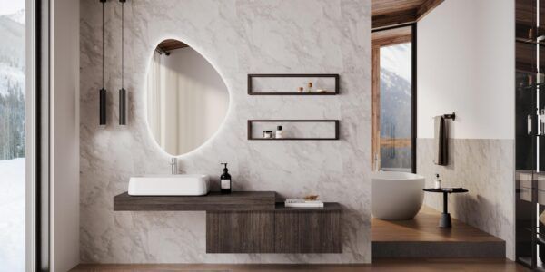 Immagina un bagno che fluttua tra legno caldo e marmo chiaro: il bagno Nilo ti avvolge con linee sospese, lavabo integrato e specchio ovale luminoso, perfetto per uno stile moderno e accogliente.