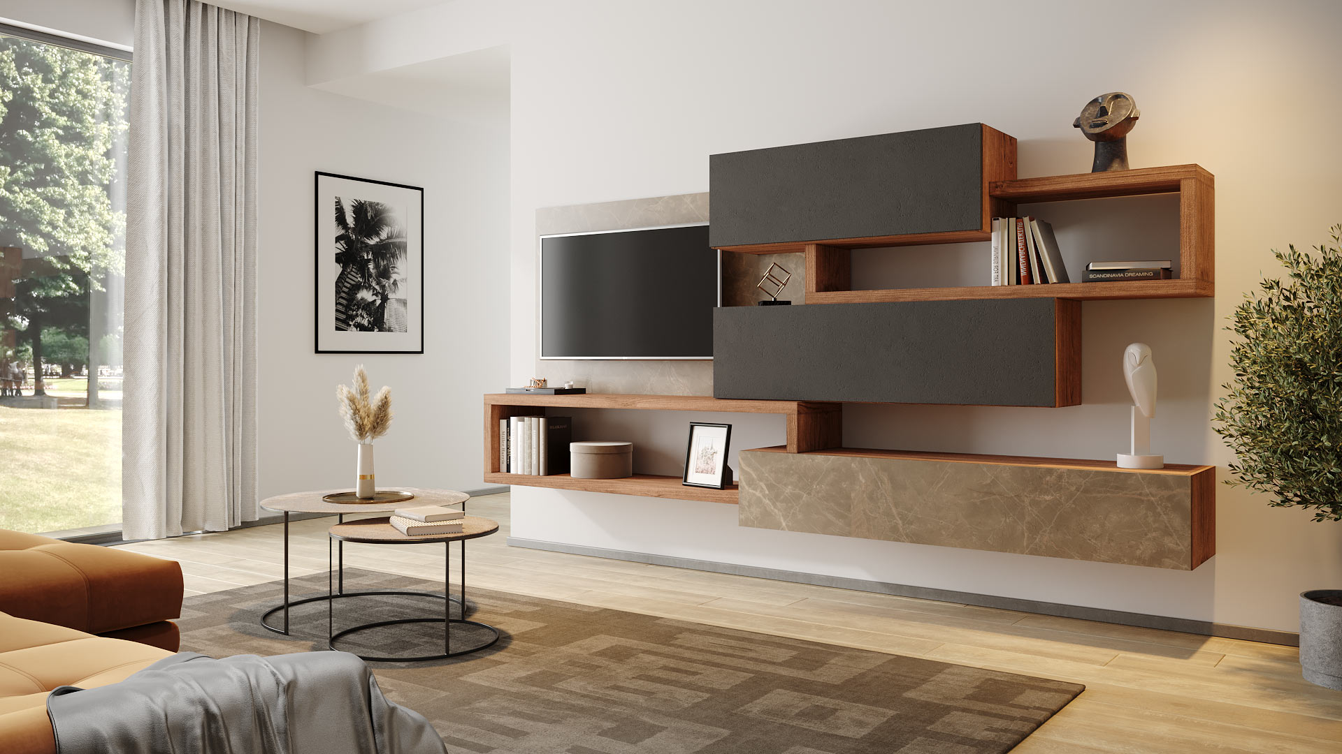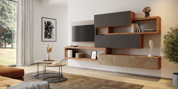 La parete attrezzata Ametista esprime un design impeccabile dalla forte personalità, ed è ideale per chi ama le nuove tendenze.